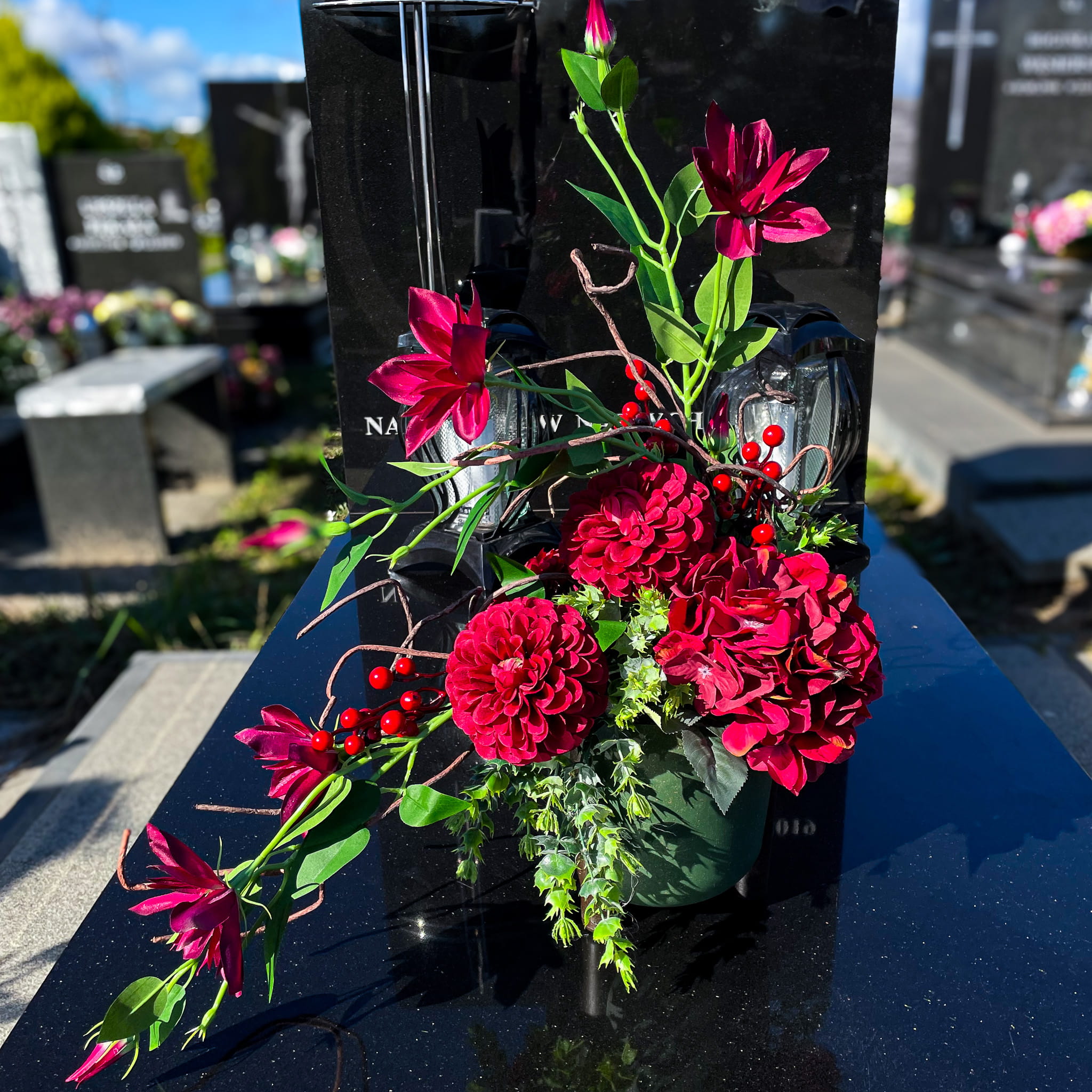 Piękna kompozycja nagrobna w bordowej kolorystyce. Dekoracja na cmentarz wykonana w kształcie trójkąta ze sztucznych kwiatów z naturalna zielenią i suszonymi dodatkami.