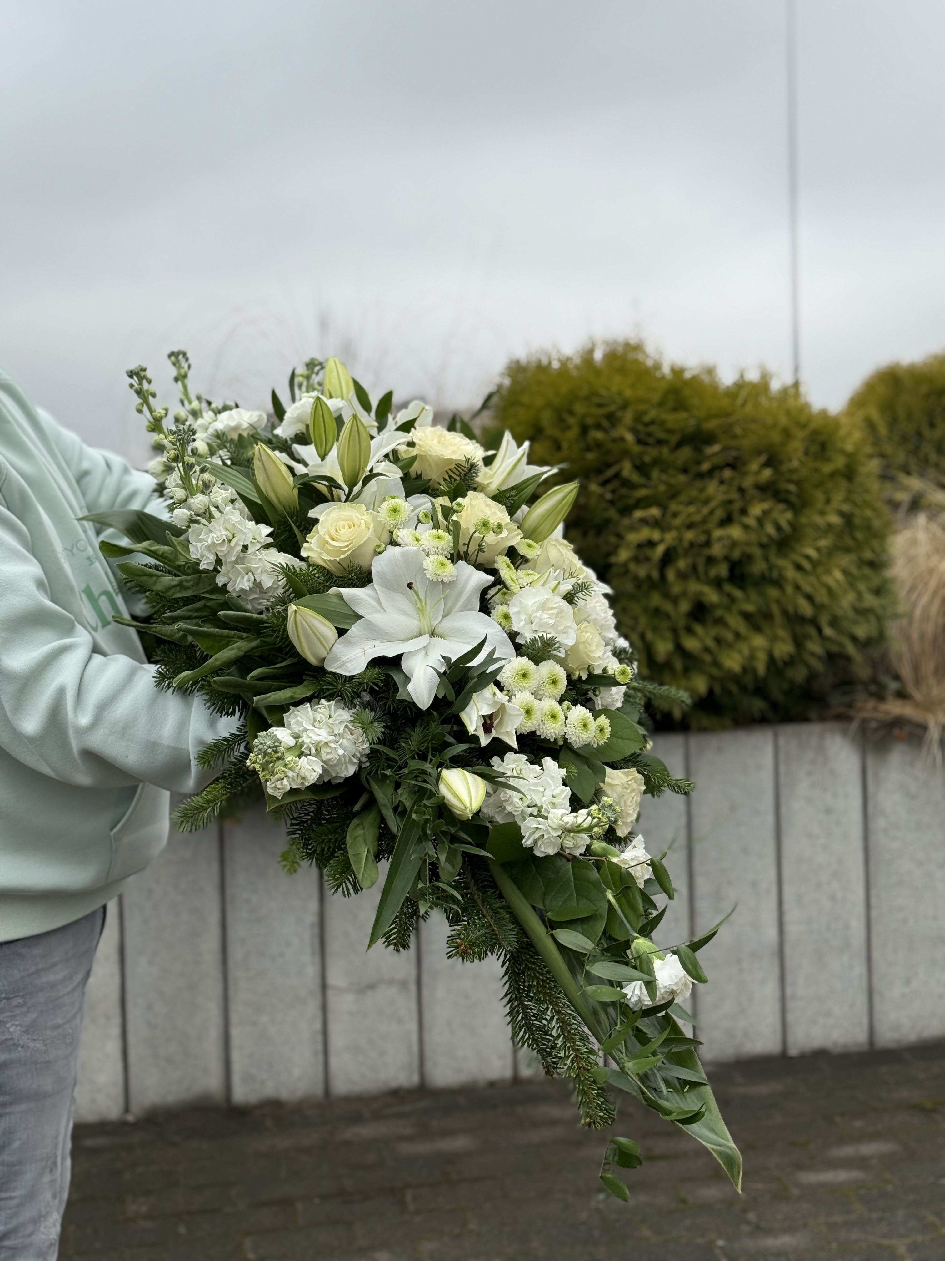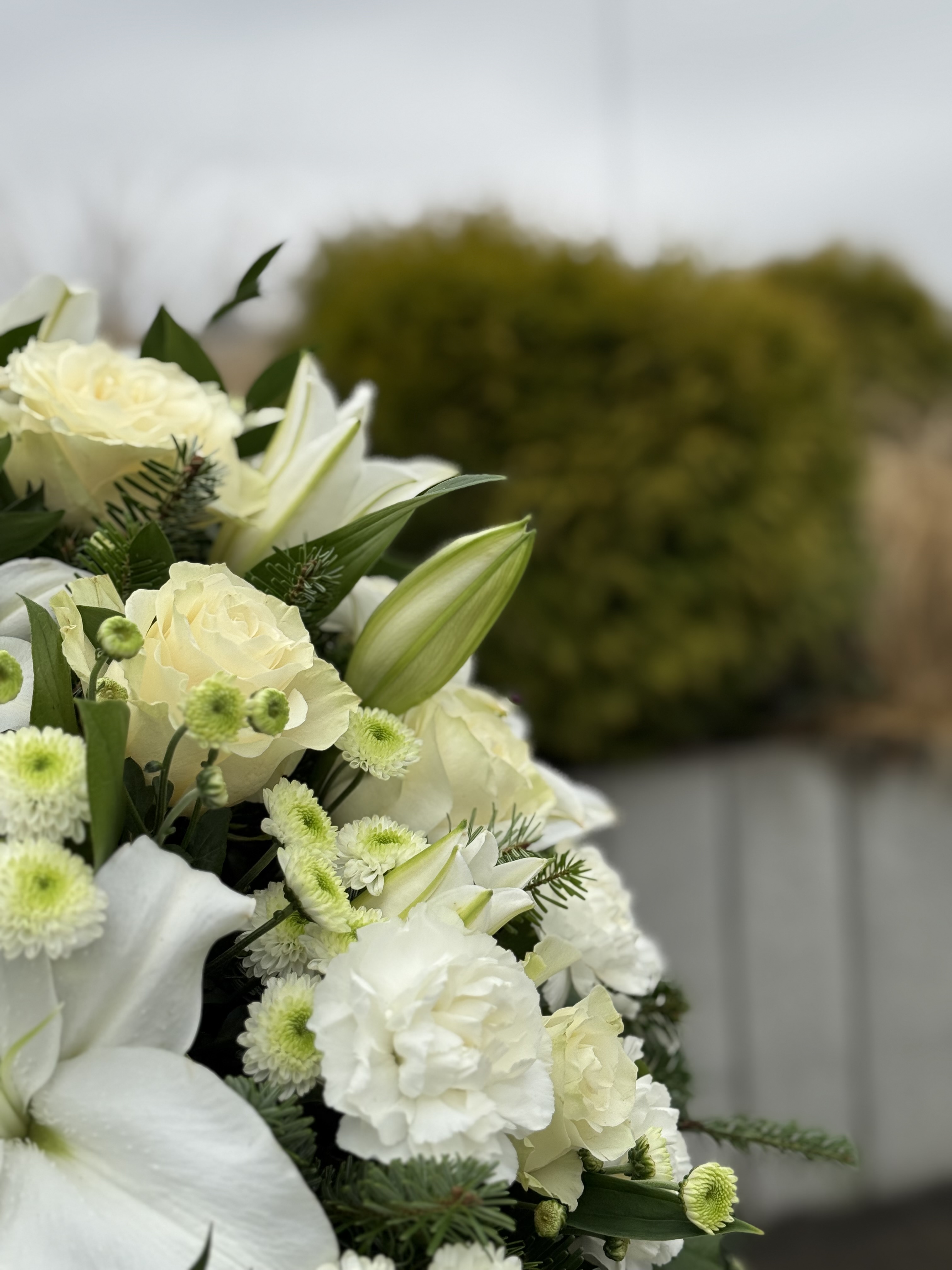 Kompozycja w kształcie łezki z białych kwiatów mieszanych, na świerku