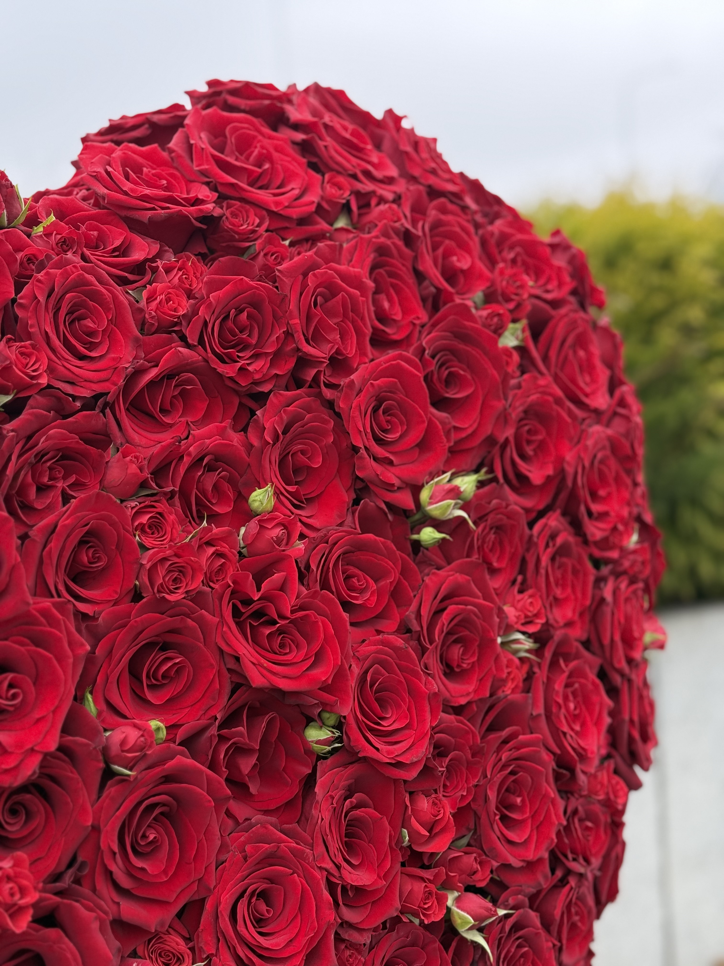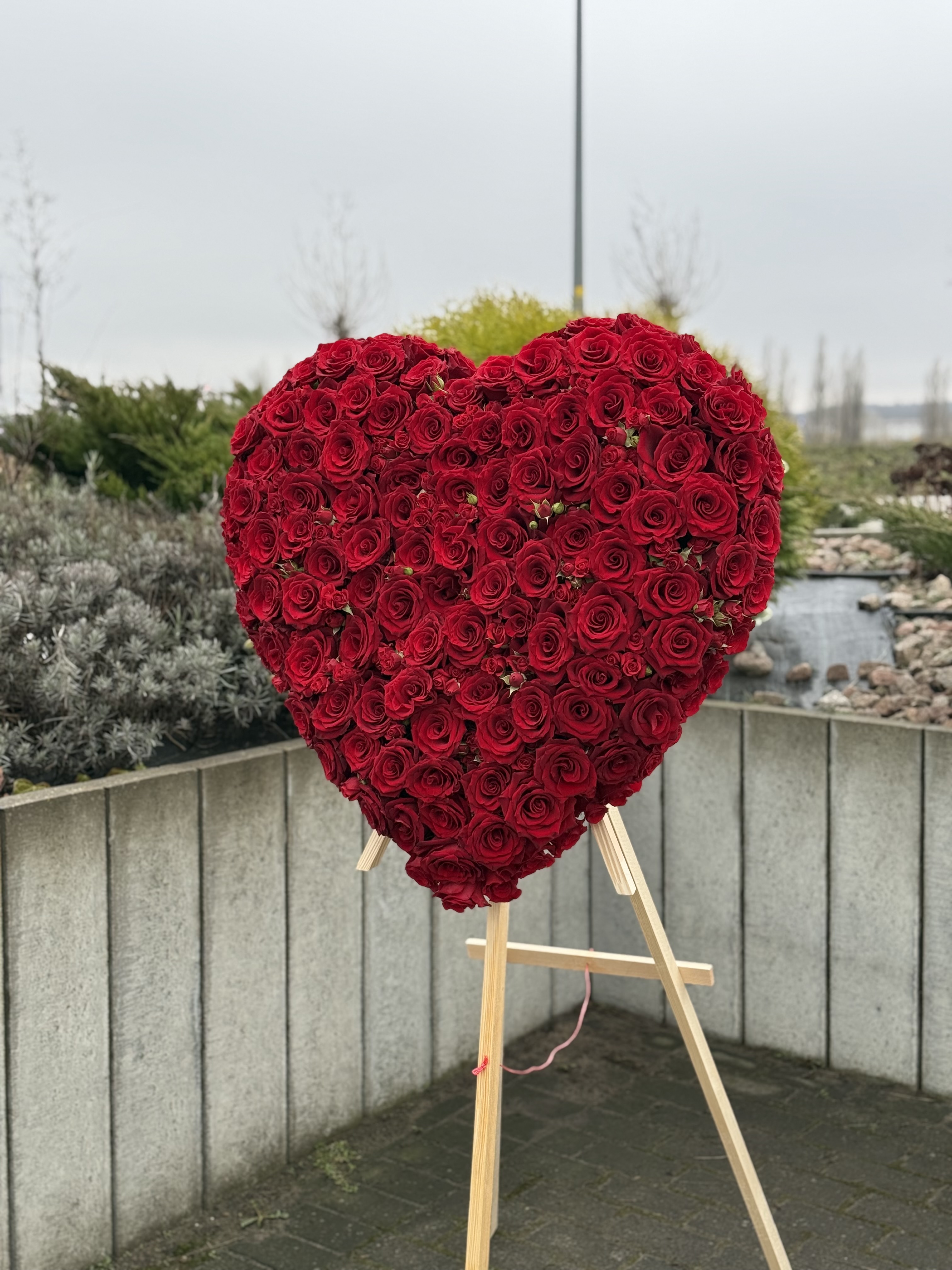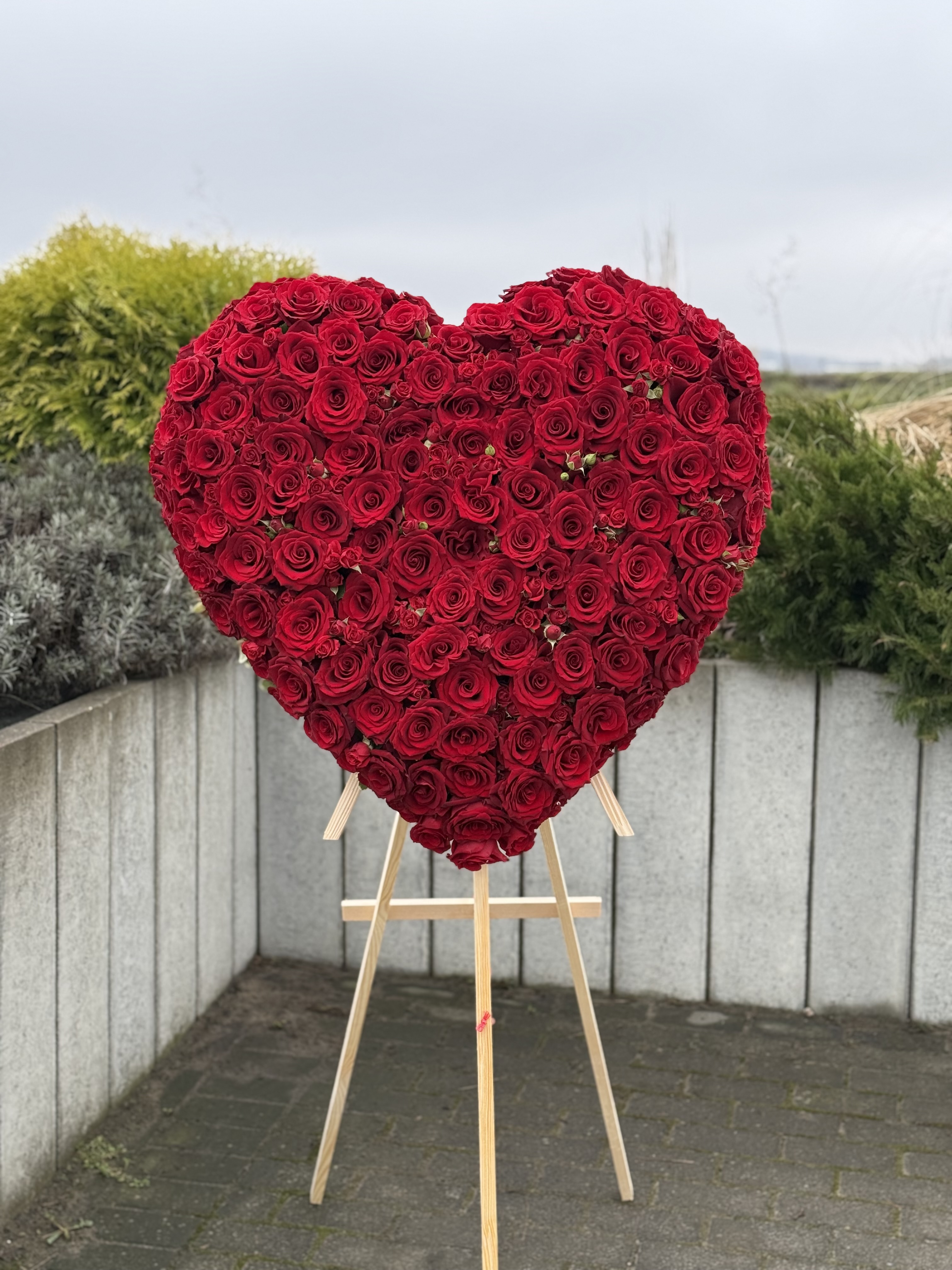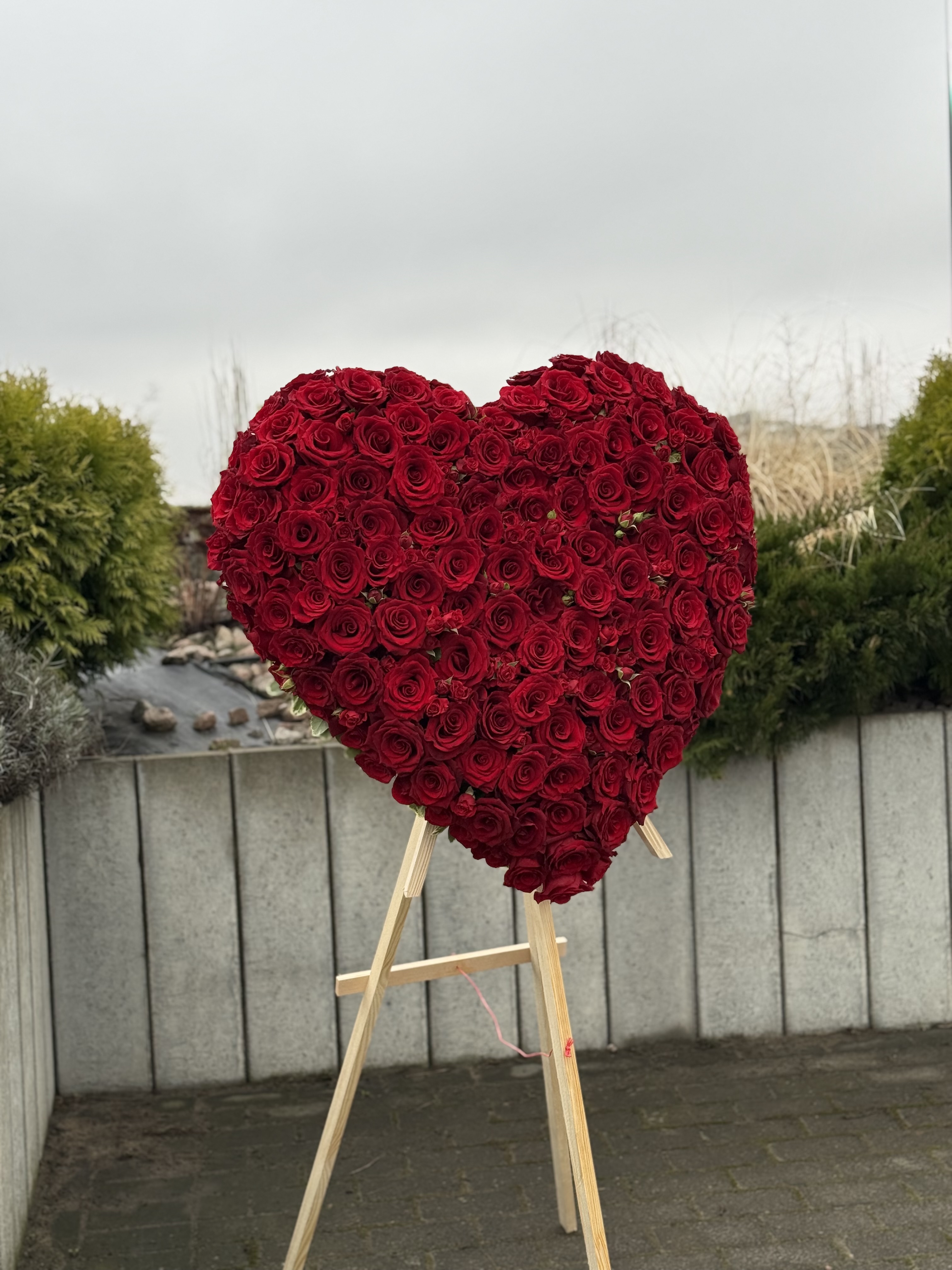 Wieniec pogzebowy w kształcie serca na krótkich nóżkach z czerwonych róż.